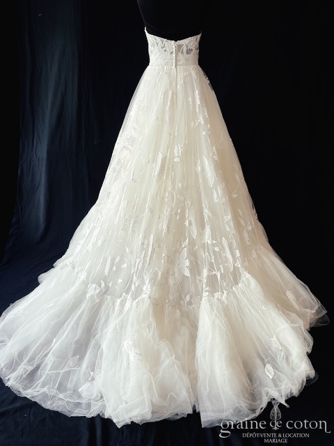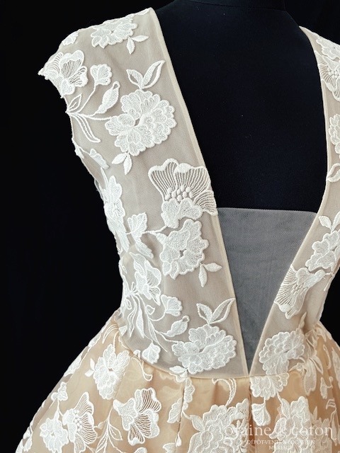Robe une pièce ivoire clair : top en dentelle ivoire et ivoire clair, bretelles et dos nu. Jupe taille haute en crêpe doublé de tulle plumetis plissé soleil. Petite traîne …