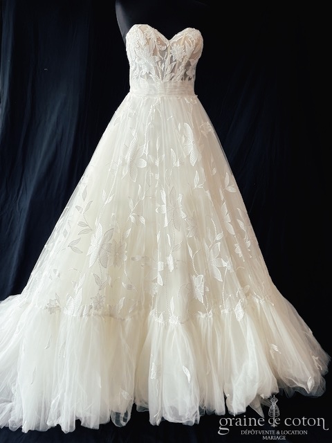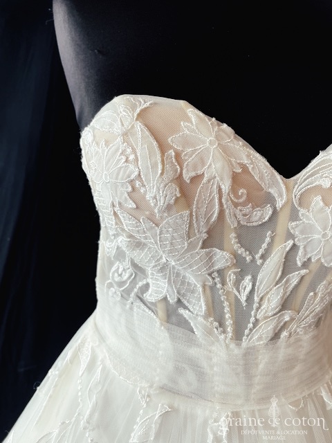 Robe une pièce en tulle et dentelle ivoire : top bustier décolleté coeur avec fleurs en relief. Jupe taille haute coupe princesse fluide avec longue traîne totalement amovible. Seyante et …
