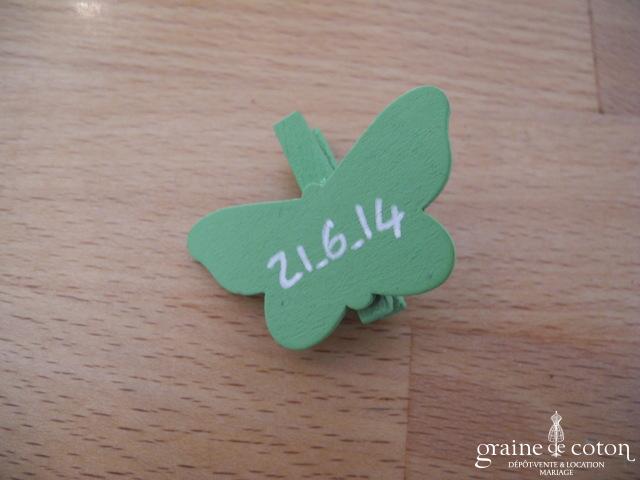 Lot de 6 pinces papillons vertes. Dimensions papillon : L4 *H2 cm. Dimensions pince et papillon : L4 * H3 cm. Les papillons étant déjà marqués, il faudra prévoir d’y …