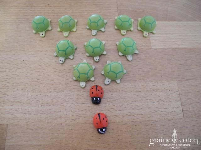 Lot de 10 petites tortues et de 2 coccinelles autocollantes. Idéales pour décorer la table des enfants.