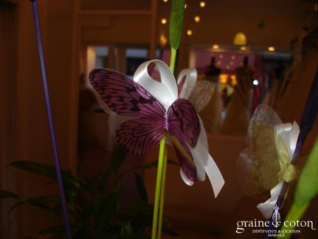 Papillon coloré sur papier rigide transparent, différents modèles. A accrocher, poser, coller ou coudre sur ruban. Modèles originaux.