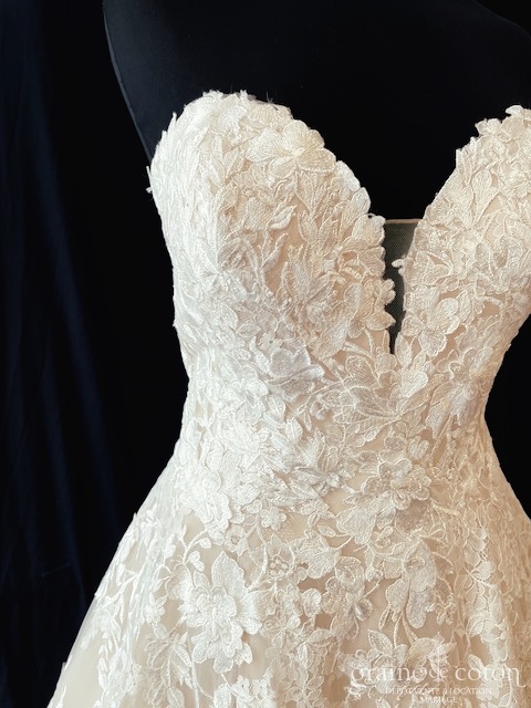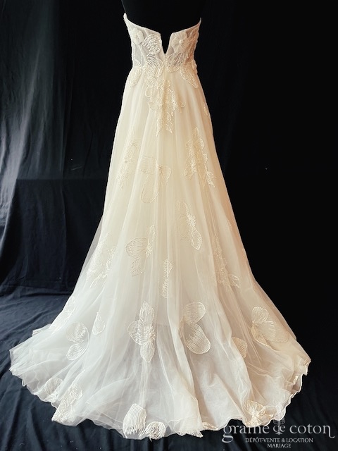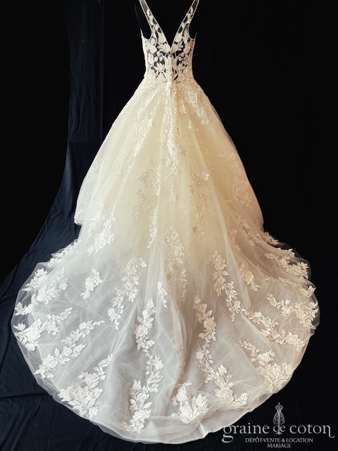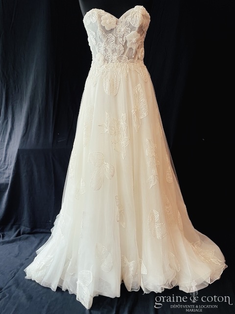 Robe une pièce en tulle et dentelle ivoire : top bustier décolleté coeur avec fleurs en relief. Jupe taille haute coupe princesse fluide avec longue traîne totalement amovible. Seyante et …
