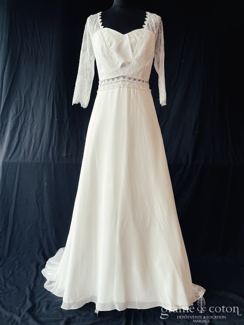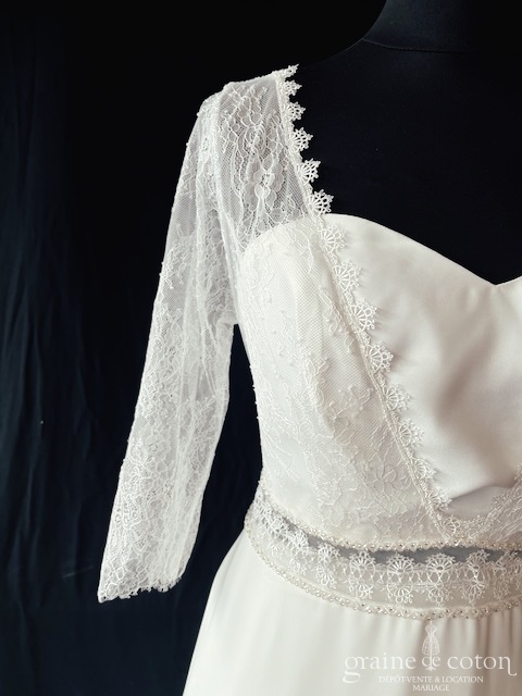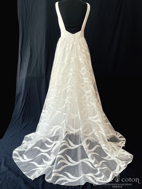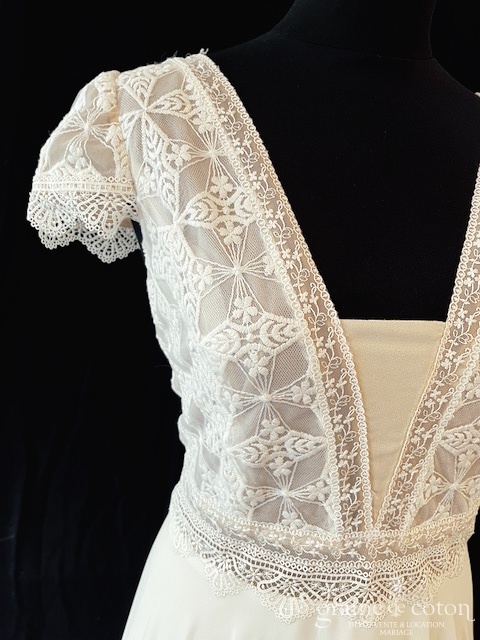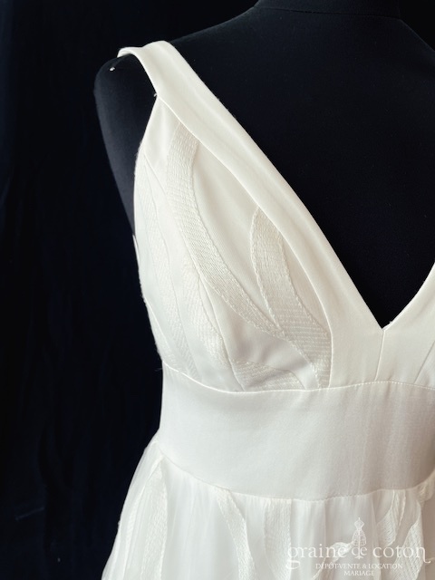 Robe une pièce ivoire : top avec larges bretelles froncées en mousseline, dentelle de Calais. Jupe fourreau fluide en mousseline légère, pas de traîne. Esprit Gatsby années 20, raffinée et …