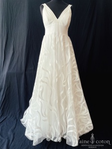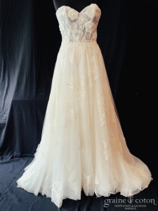 Robe une pièce ivoire clair : bustier en dentelle transparente doublée, décolleté coeur. Jupe taille haute princesse en tulle fluide et dentelle, large volant de tulle en bas, traîne. Seyante, …