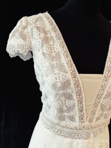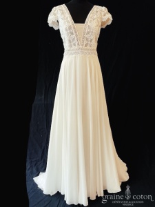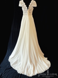 Robe une pièce ivoire : top en guipure encolure ronde avec manches longues, dos nu. Jupe taille haute fluide en crêpe de soie épuré, poches, pas de traîne. Bohème chic. …