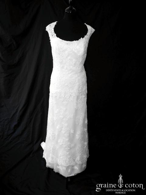 Robe un epièce ivoire clair : top en fine dentelle avec décolleté en V et dos nu. Jupe taille haute en mousseline fluide et épurée, petite traîne. Fraîche, légère, bohème …