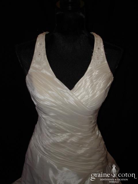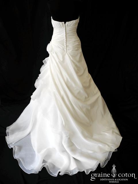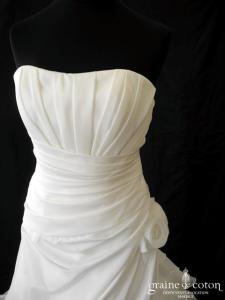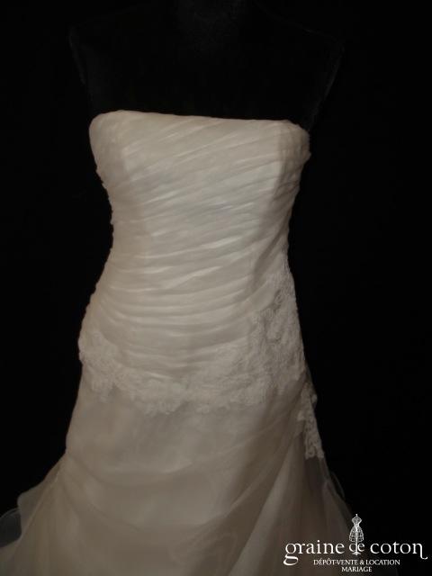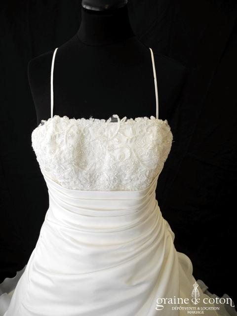 Robe une pièce en organza ivoire : bustier drapé avec tour de cou amovible tout comme les bretelles. Guipure de dentelle sur la taille basse, dos boutonné puis jupe légèrement …