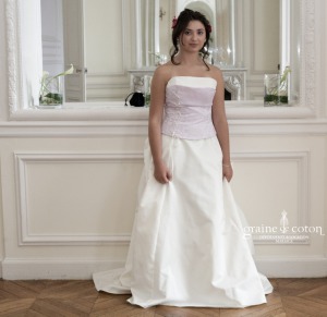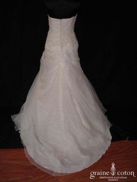Robe une pièce en organza : bustier coeur drapé avec perles transparentes. Jupe en volants d’organza avec traîne. Seyante et lumineuse.