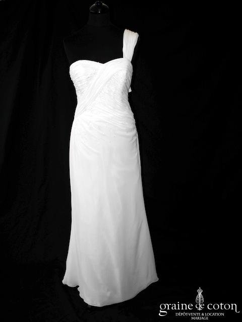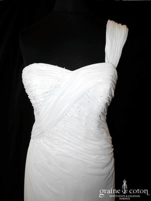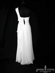 Robe une pièce en mousseline ivoire clair : bustier drapé avec une large bretelle asymétrique se finissant par un noeud dans le dos. Jupe fluide peu évasée sans traîne. Légère, …