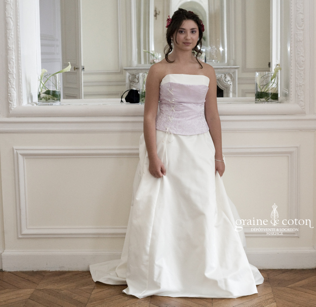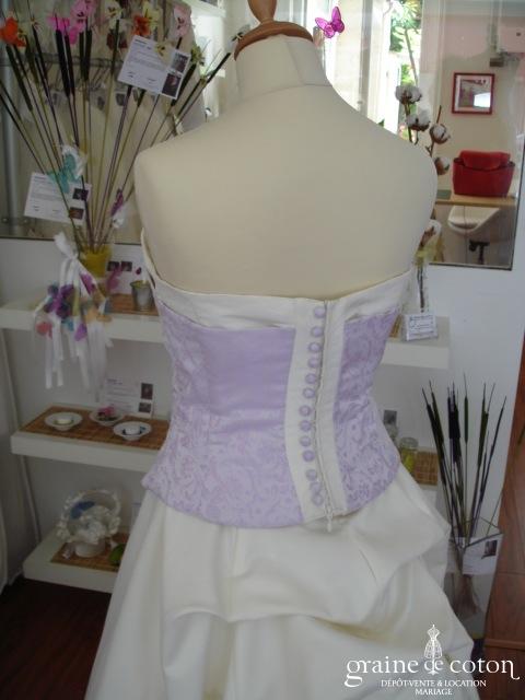 Robe deux pièces ivoire et lilas : bustier couleur lilas avec impressions plus foncées, laçage décoratif sur le devant côté avec un ruban de satin ivoire, petits boutons le long …