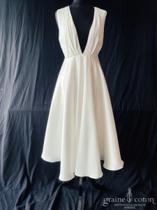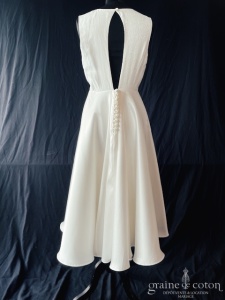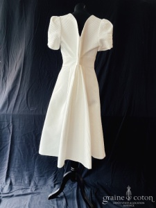 Robe une pièce en midako plumetis ivoire clair : décolleté en V, manches courtes et dos en V également. Empiècement à la taille. Jupe taille haute épurée, poches, longueur midi. …
