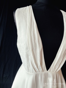 Robe une pièce ivoire clair : top en guipure décolleté V et dos nu. Taille haute marquée d’une ceinture drapée. Jupe fluide épurée en mousseline de soie, petite traîne. Bohème …
