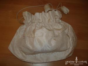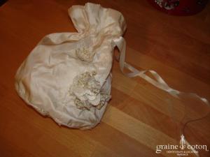 Aumonière en satin ivoire avec guipure de dentelle, fermeture par un ruban d’organza.