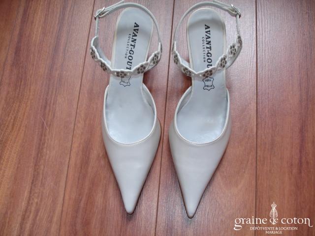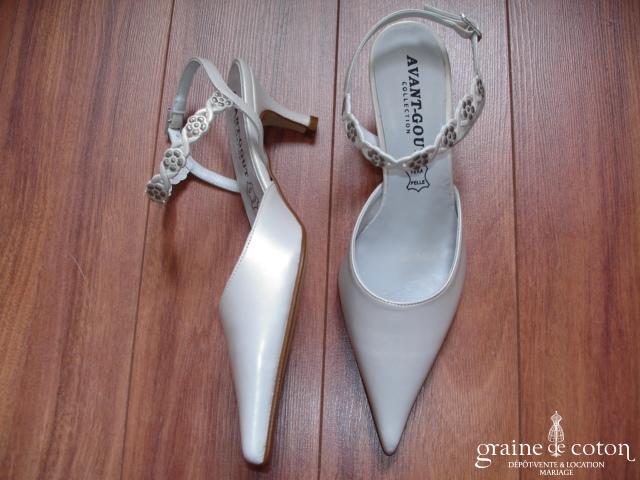Escarpins à bouts pointus ivoire nacrés, intérieur cuir. Lanière tour de cheville avec petites fleurs. Talon de 6 cm.