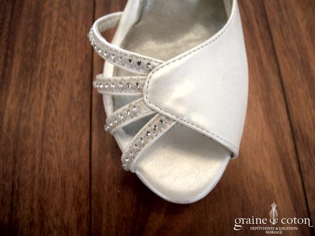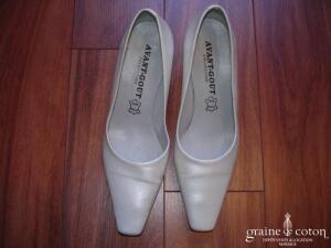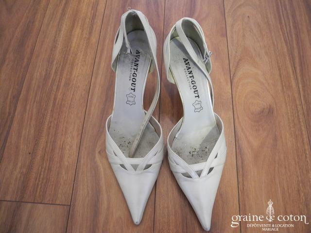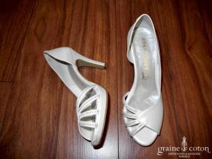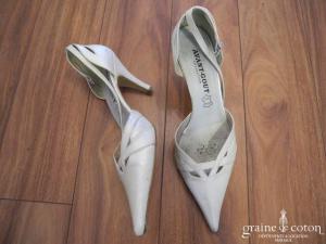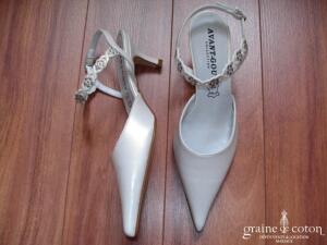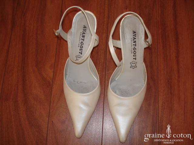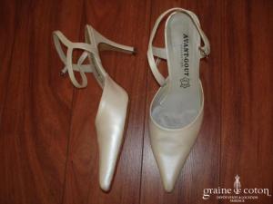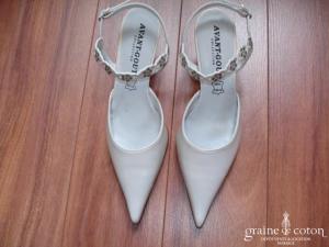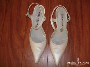 Escarpins à bouts pointus avec lanières tour de chevielle, couleur ivoire nacré. semelle intérieure cuir. Talons de 7,5 cm.