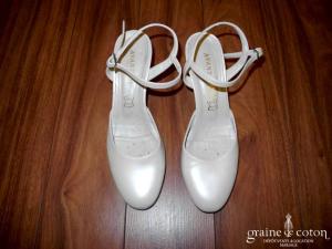 Escarpins en cuir nacré, bouts ronds et petite lanière à la cheville. Talon de 7,5 cm.