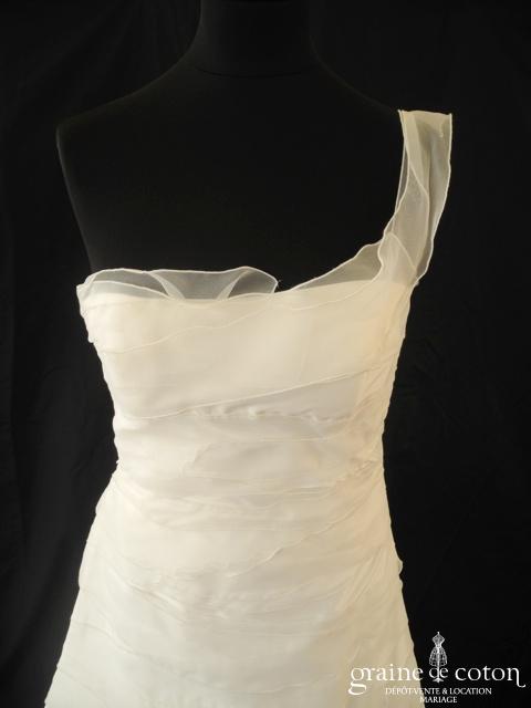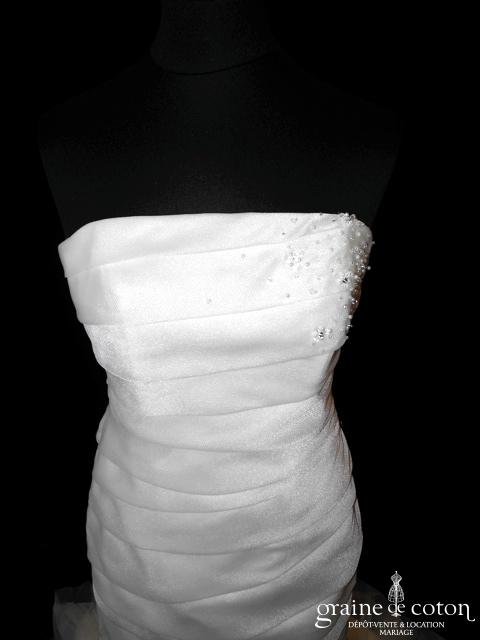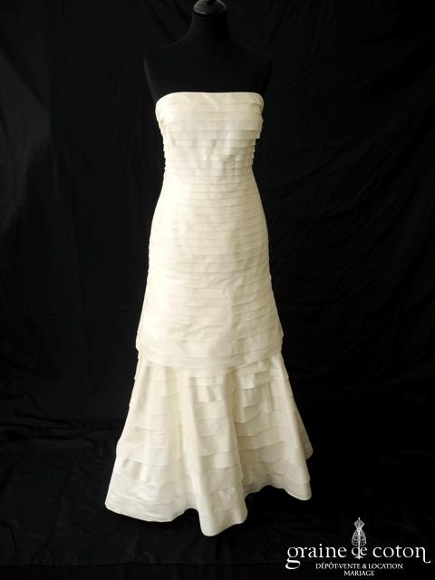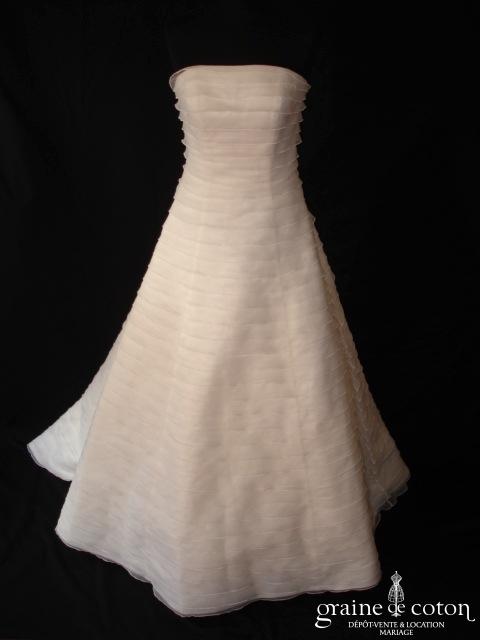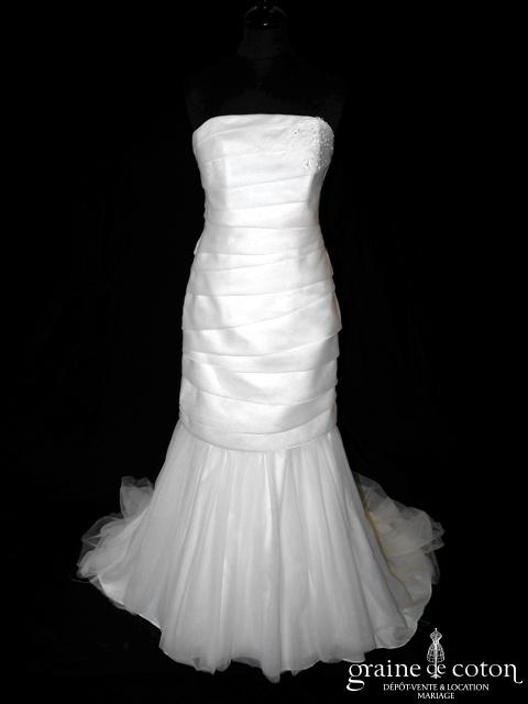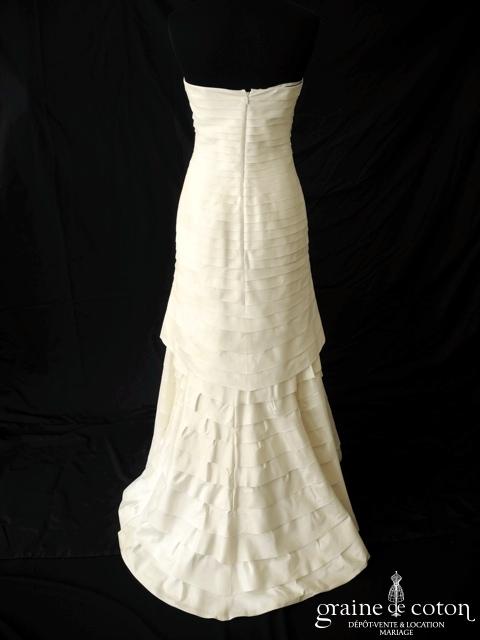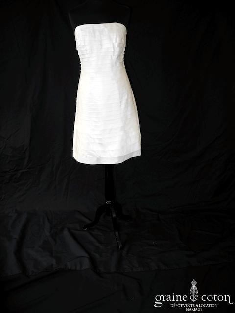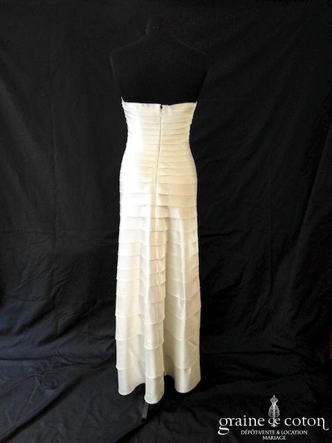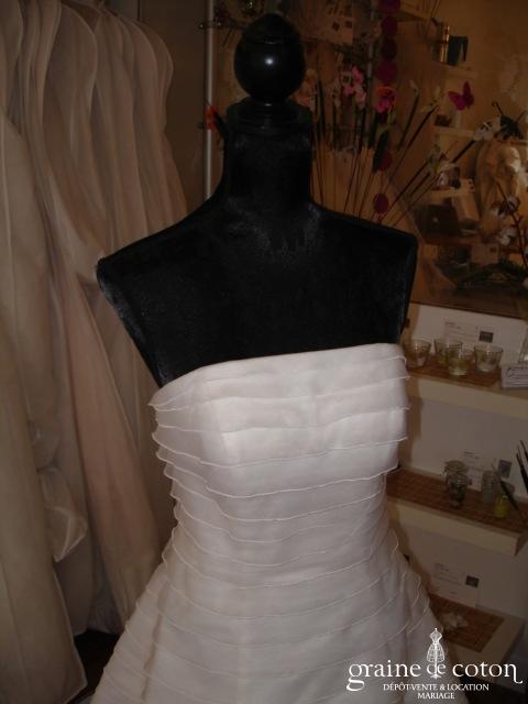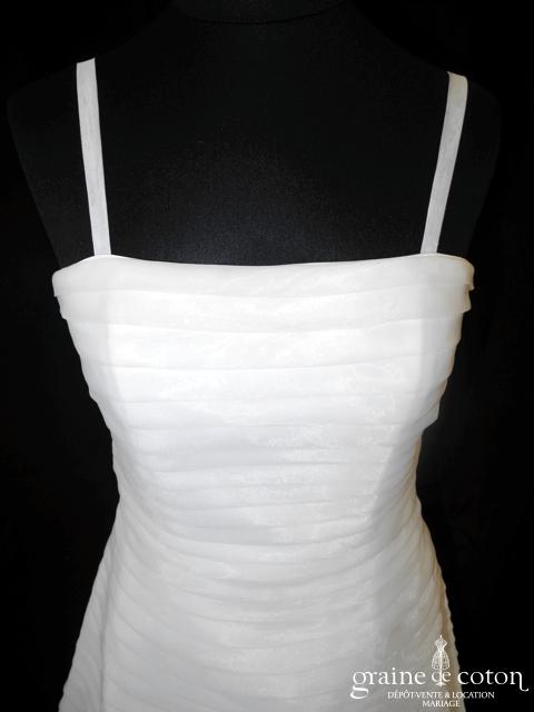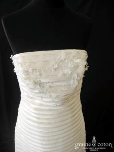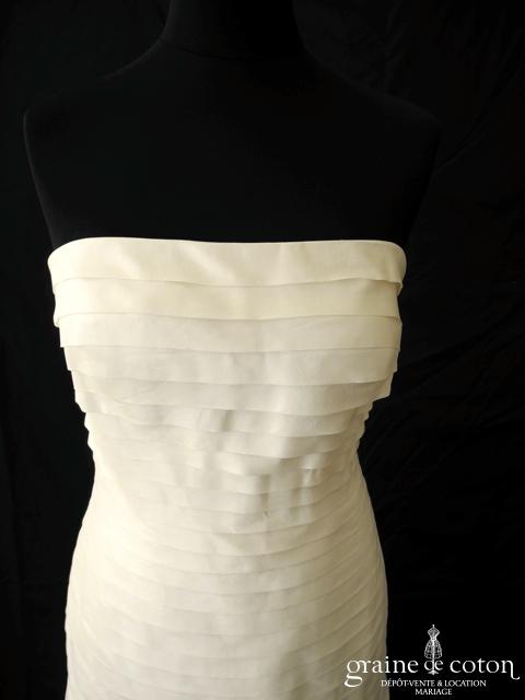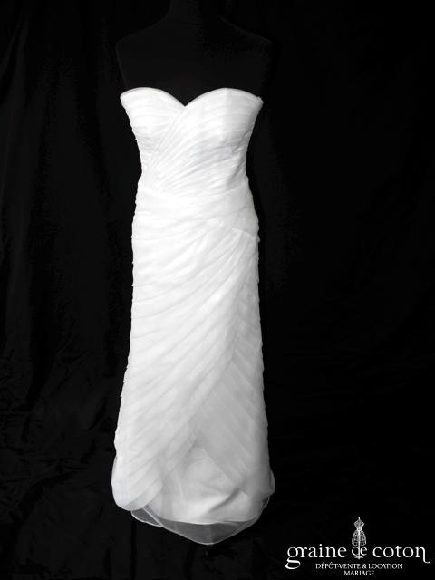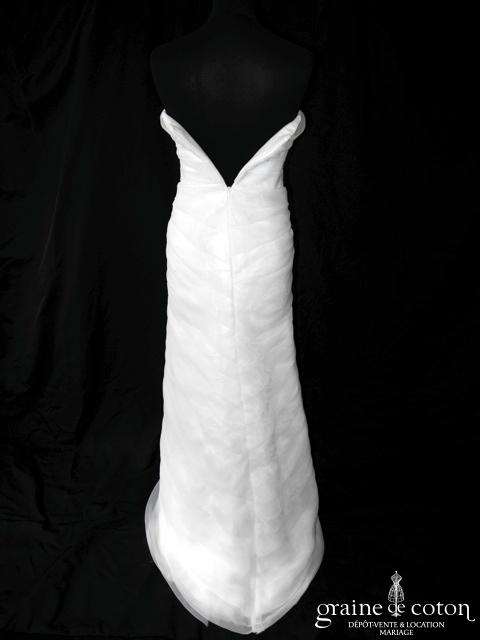 Robe une pièce tout en bandes d’organza blanc : bustier coeur, taille marquée, jupe fourreau quasi droite, très près du corps, avec petite traîne. Belle silhouette.