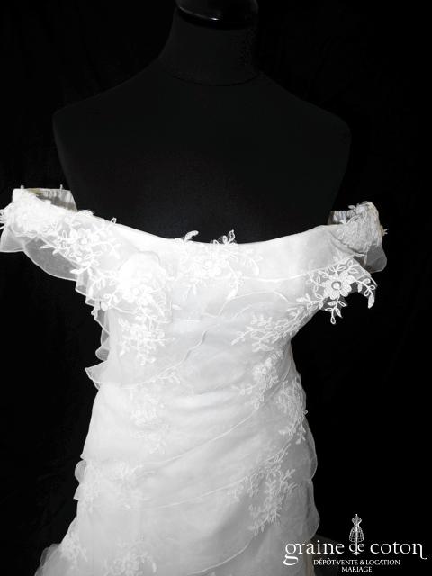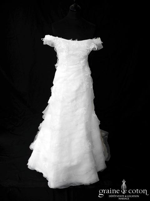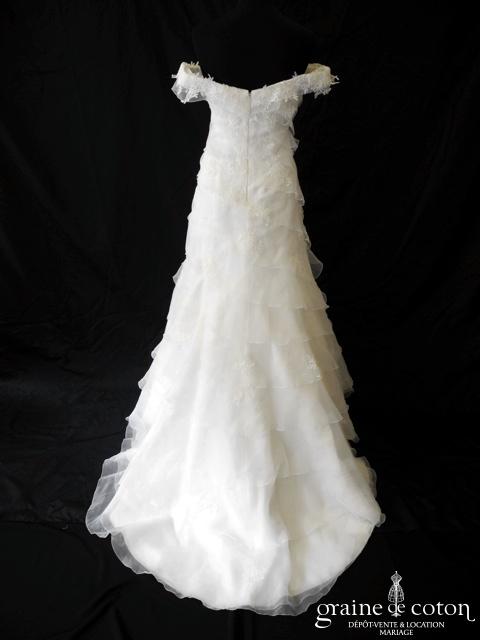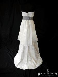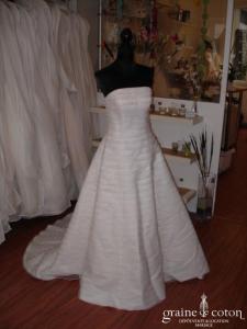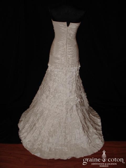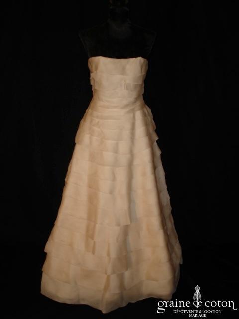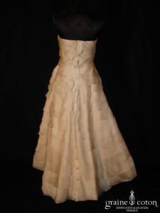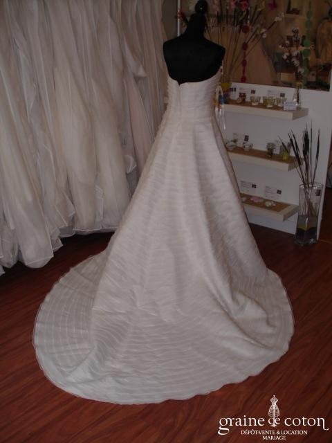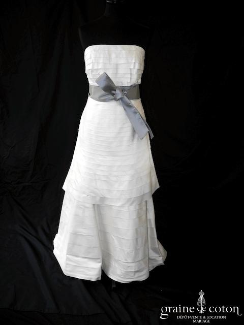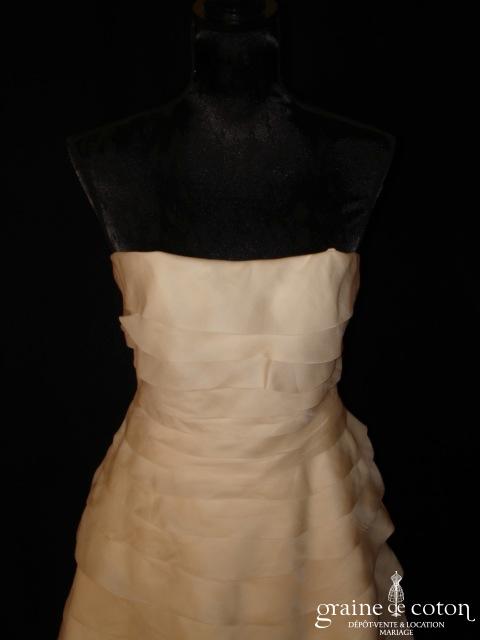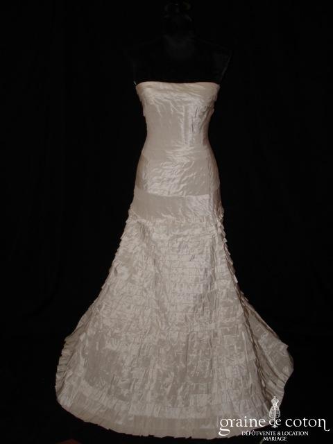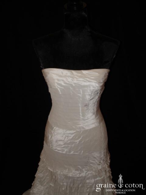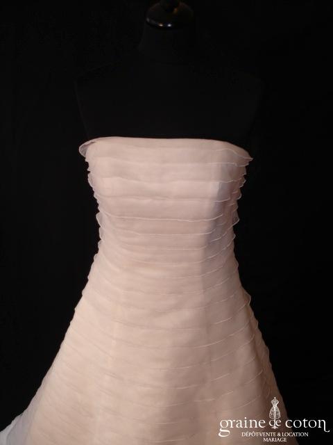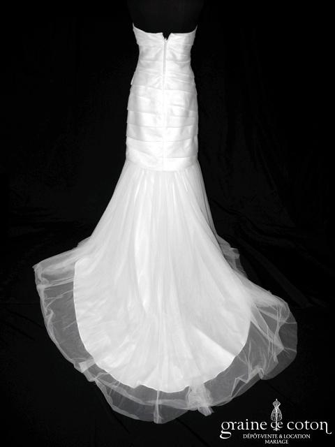 Robe une pièce tout en bandes d’organza blanc : bustier coeur, taille marquée, jupe fourreau quasi droite, très près du corps, avec petite traîne. Belle silhouette.
