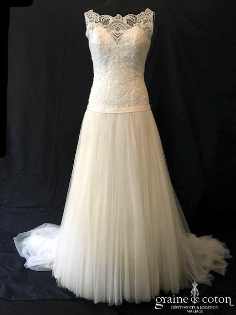 Robe une pièce ivoire clair : top en dentelle perlée, décolleté en V et dos nu, bretelles. Jupe taille haute en tulle extra souple, fendue, avec longue traîne.