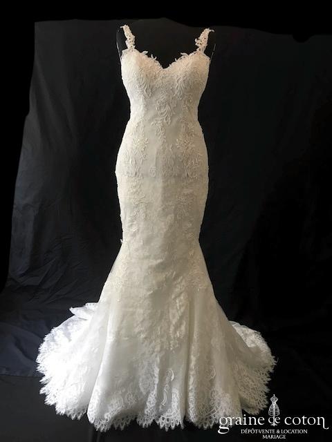 Robe une pièce ivoire clair : top en dentelle décolleté V, dos nu. La dentelle est délicatement travaillée de sequins. Jupe empire avec bandes de dentelle, fluide avec traîne. Légère …