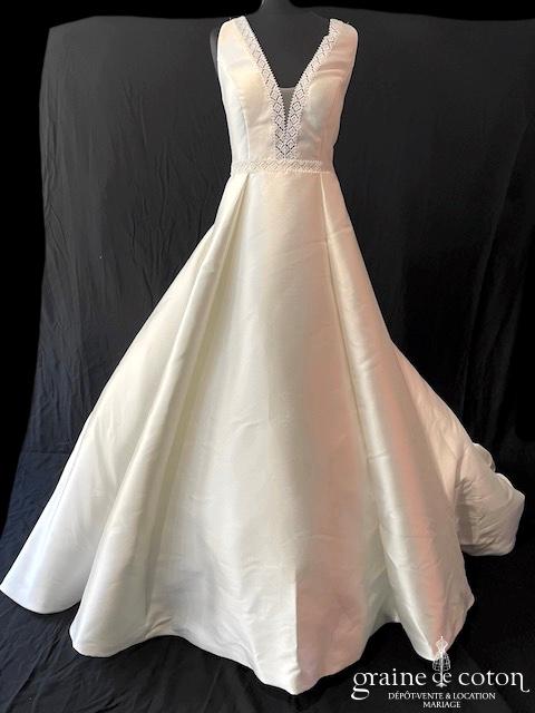 Robe une pièce tout en mikado ivoire clair : top avec bretelles, décolleté en V bordé d’un galon de guipure et large empiècement à la taille. Jupe haute largement évasée …