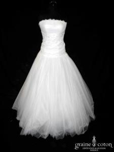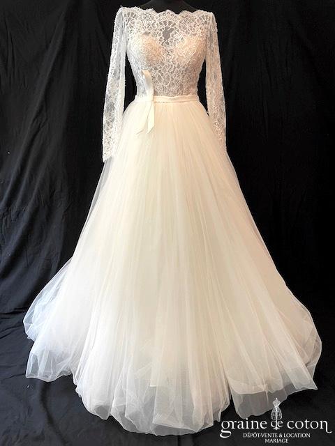 Robe une pièce ivoire clair : top en dentelle perlée avec petites manches et dos entièrement boutonné, col rond. Jupe taille haute en tulle extra fluide épuré, effet mousseline, longue …
