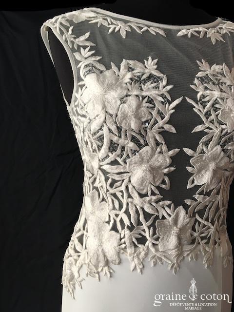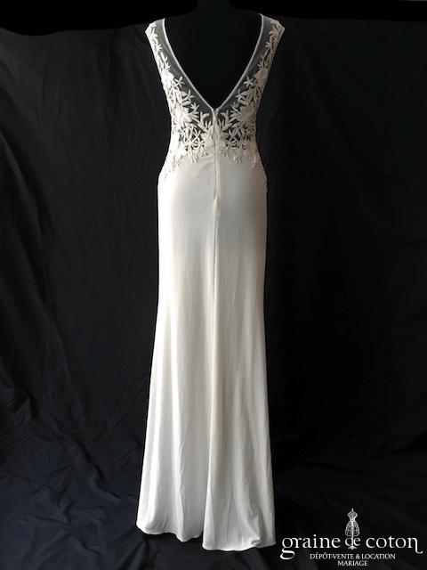 Robe une pièce ivoire clair : top avec bretelles en dentelle brodée, dos nu en V. Jupe fourreau en crêpe, fendue jusqu’au genou, petite traîne. Chic et glamour.