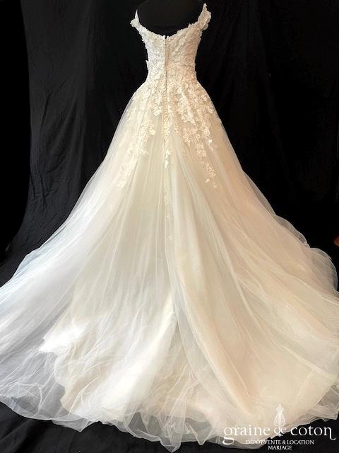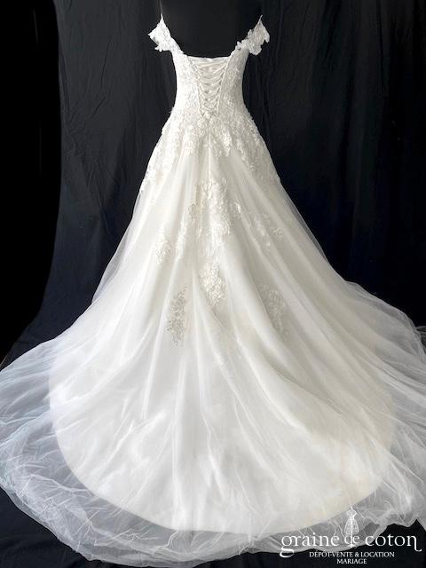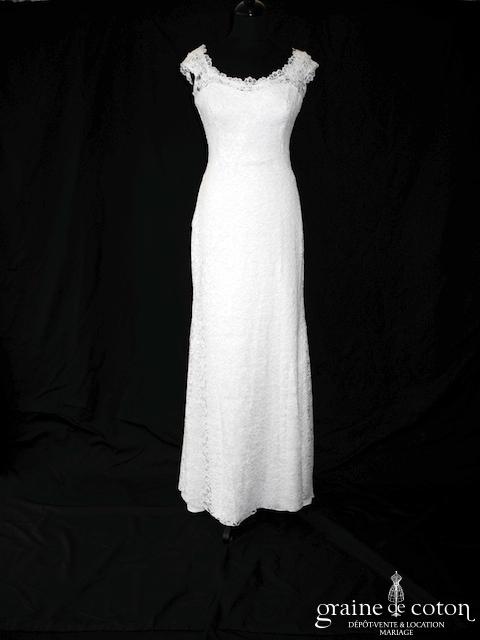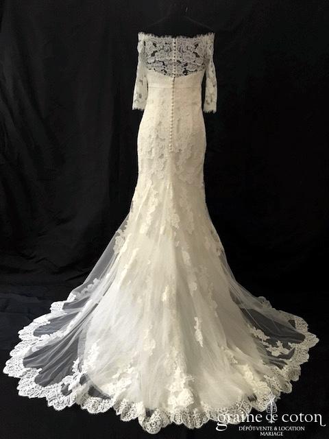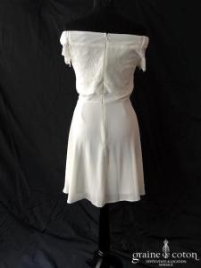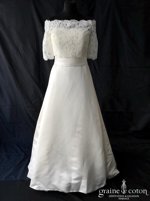 Boléro à fermer dans le dos en fine dentelle ivoire et petites manches, encolure bateau. Très belle matière. Transforme une robe bustier sans la dénaturer ;o)