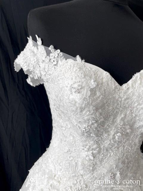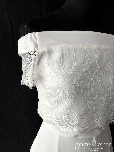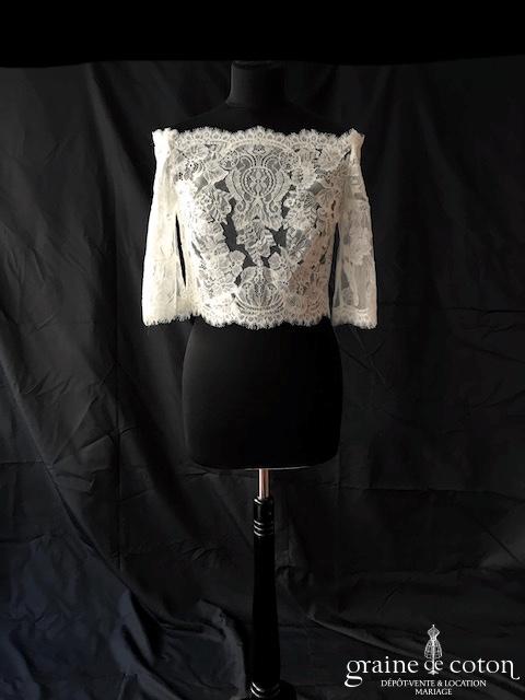 Boléro en fine dentelle de Chantilly ivoire à manches courtes et encolure bateau