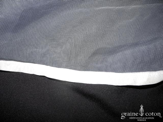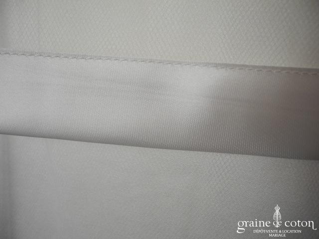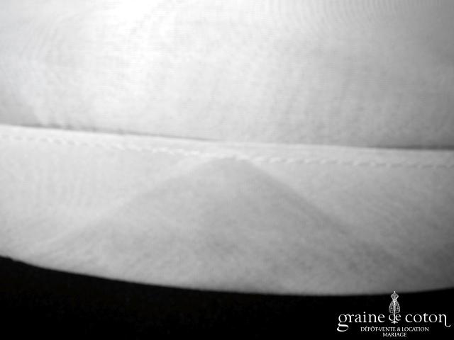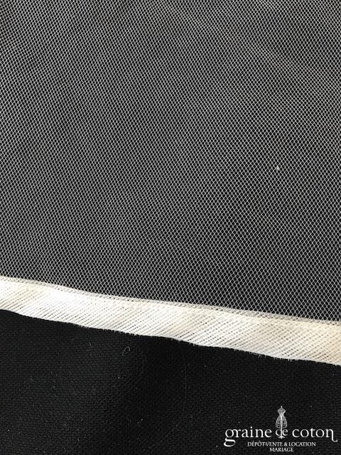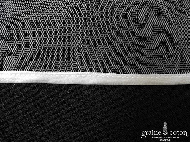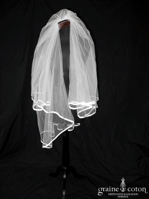 Voile mi long en tulle blanc bordé d’un biais de satin. Monté sur peigne, avec rabat avant.
