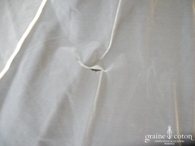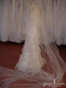 Voile long de 2 mètres en tulle ivoire bordé d’un biais de satin. Monté sur peigne, avec rabat avant.