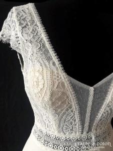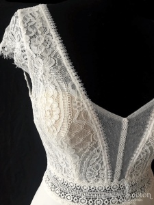 Boléro encolure en V à manches courtes en guipure et dentelle ivoire, dos nu fermé en haut et boutonné.
