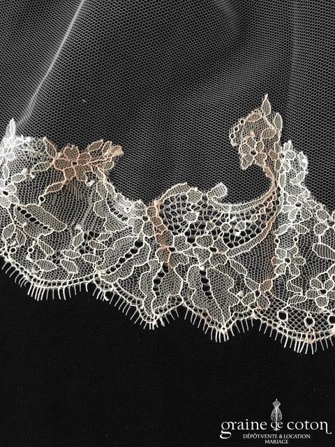 Voile long de 2 mètres en tulle ivoire bordé d’un biais de satin. Monté sur peigne, avec rabat avant.