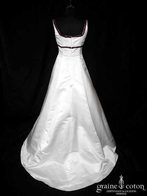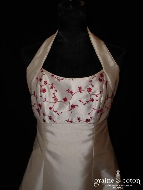 Robe deux pièces rouge foncé/brodeaux pouvant servir de robe de soirée ou de robe de mariée. Bustier irisé, avec un voile amovible. Jupe drapé de tulle et d’organza, tenus par …