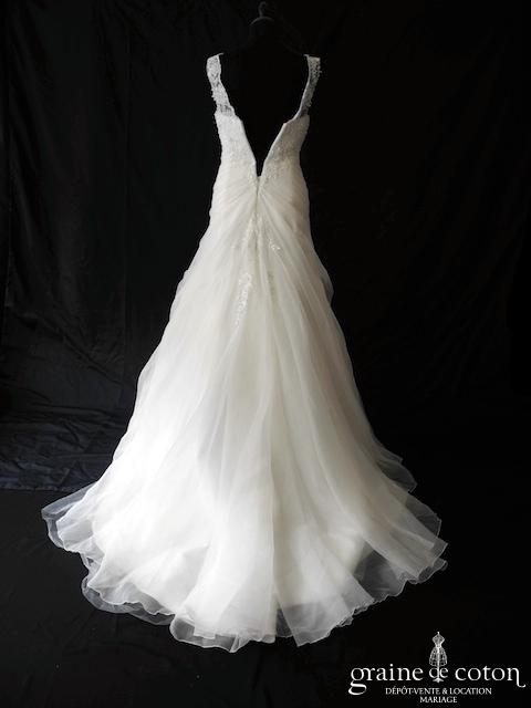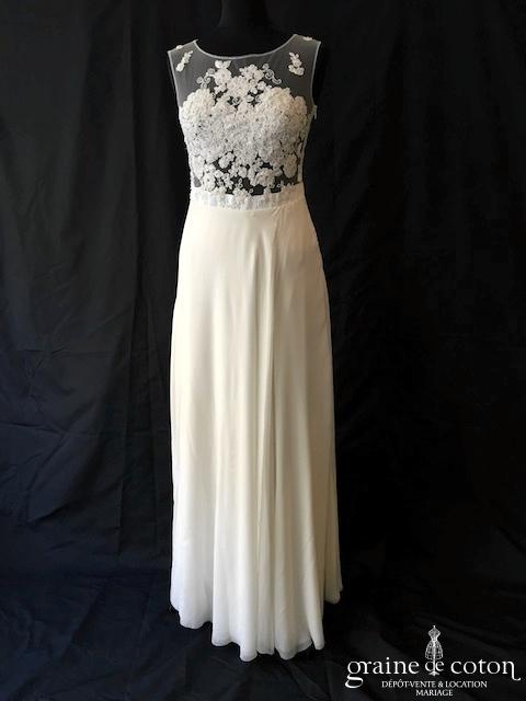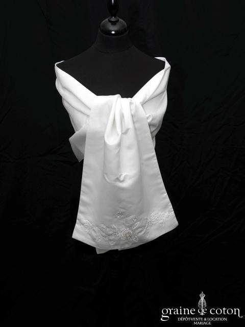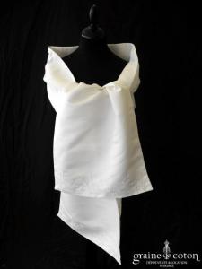 Étole en satin duchesse ivoire clair brodée de feuilles argentées. Dimensions : 37*220 cm.