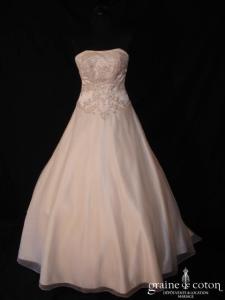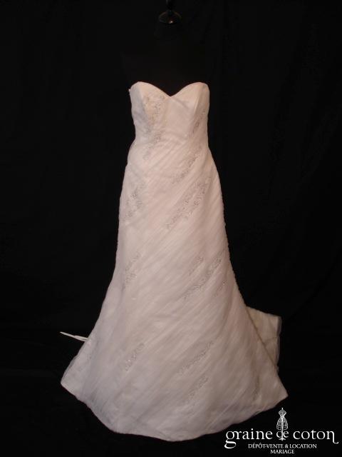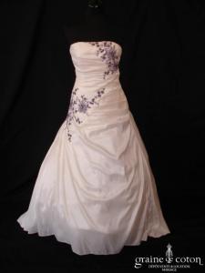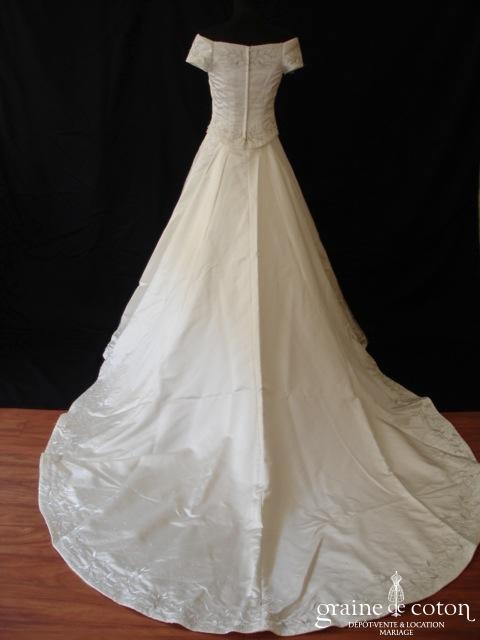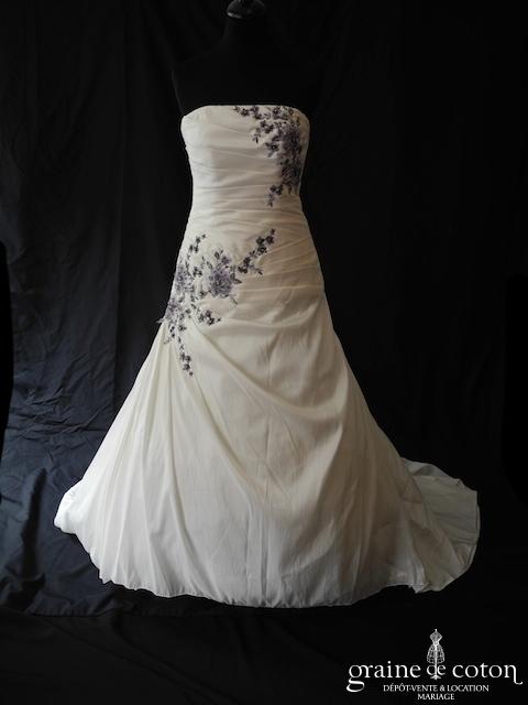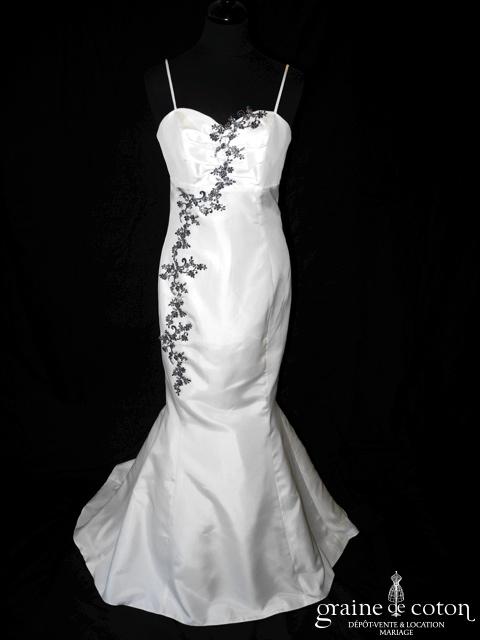 Robe une pièce en satin ivoire : bustier avec petites manches aux épaules, bustier brodé de perles et de fleurs blanches et argentées, jupe avec rappel des motifs du bustier. …