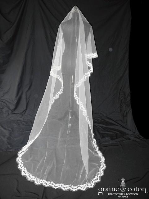 Voile long de 3 mètres en tulle ivoire bordé de broderies, non monté sur peigne. Applications de fleurs en dentelle sur tout le voile.
