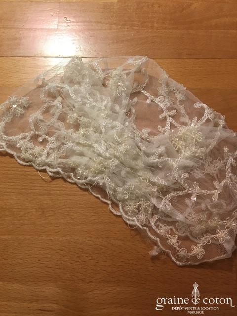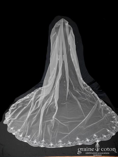 Voile long de 3 mètres en tulle ivoire bordé de broderies