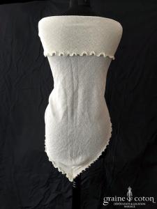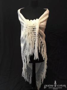 Châle rectangulaire en laine ivoire ajourée – fait main. Dimensions plié en deux (triangle) : base 170 * hauteur 55 cm.