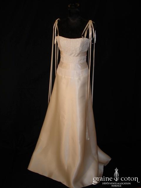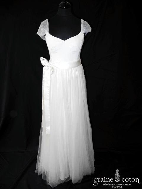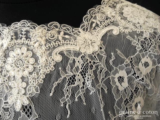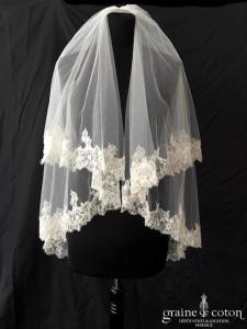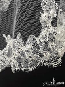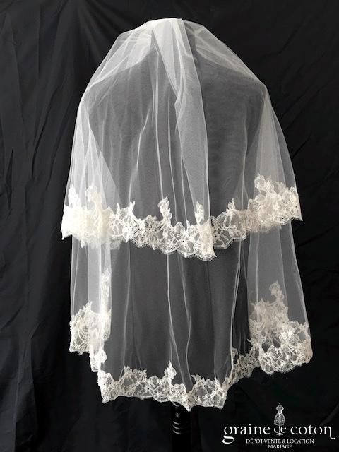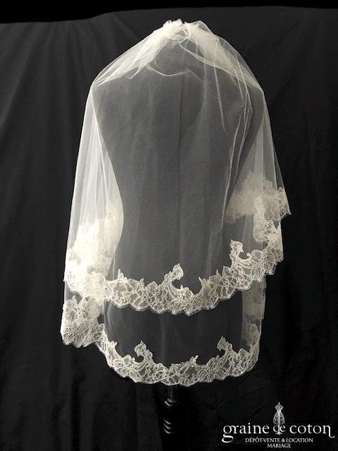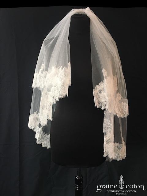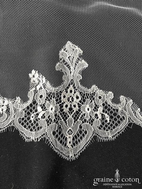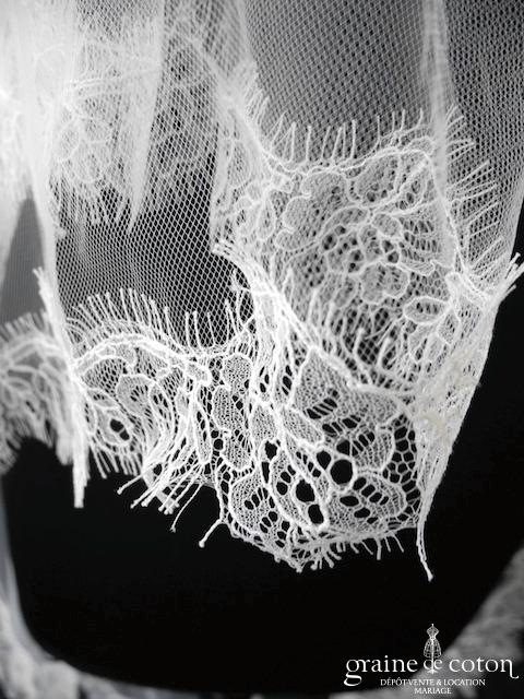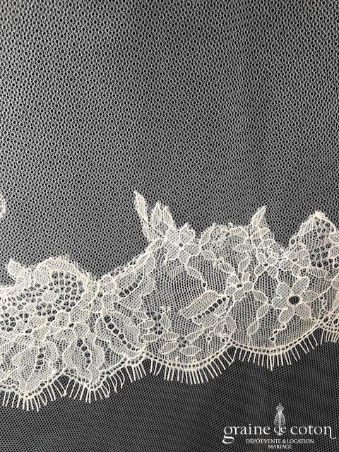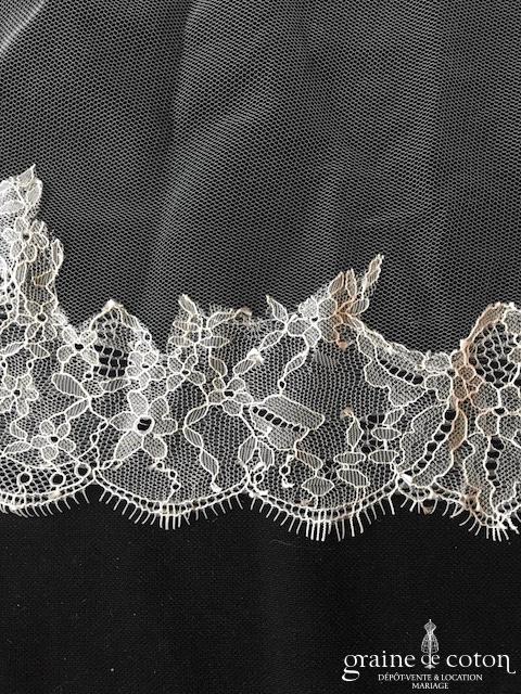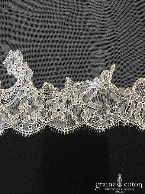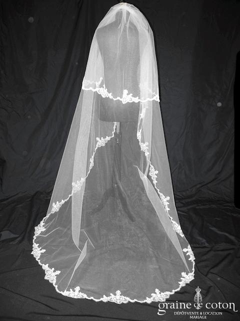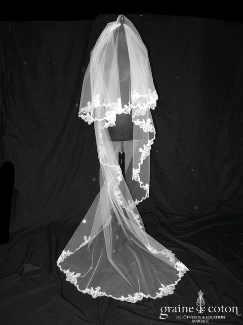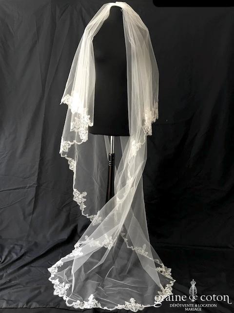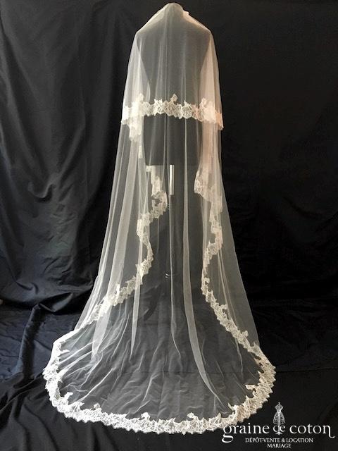 Voile long de 2 mètres en tulle ivoire clair bordé de fine dentelle de Chantilly