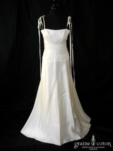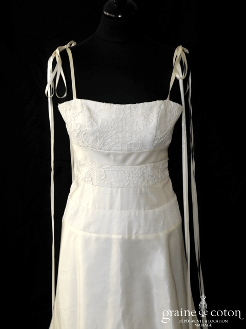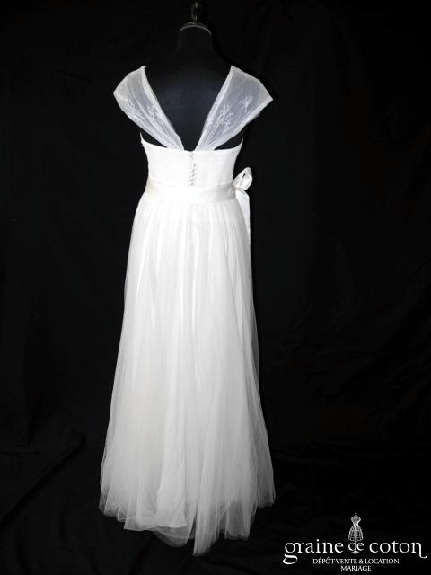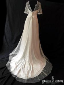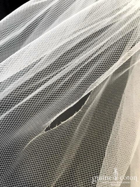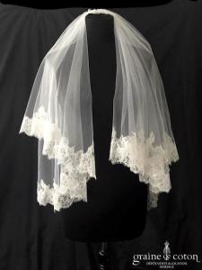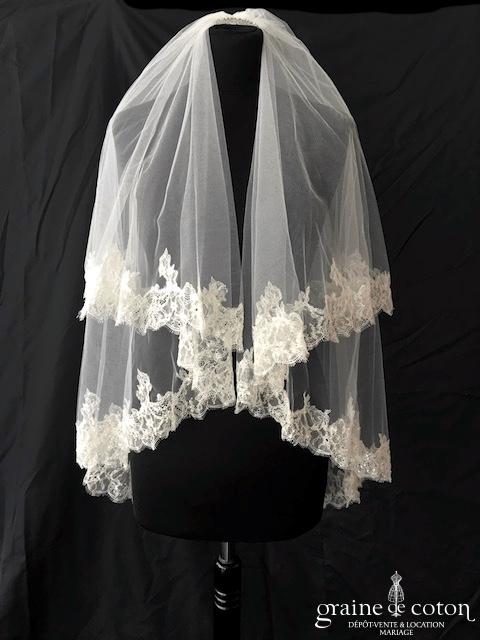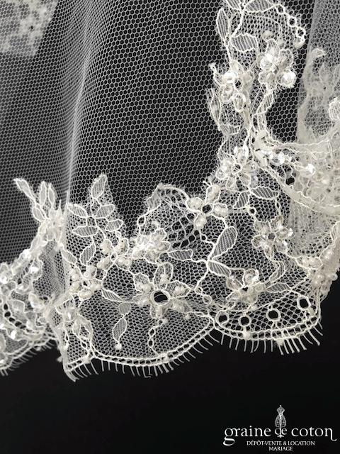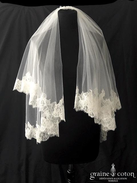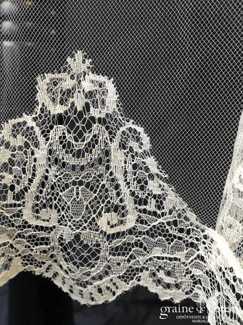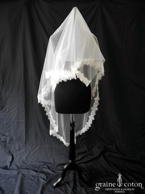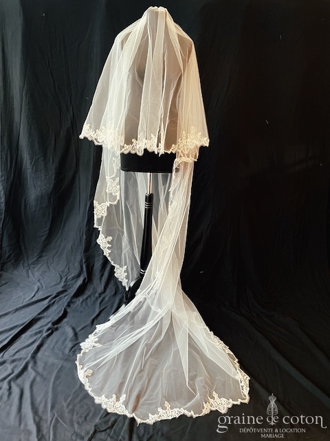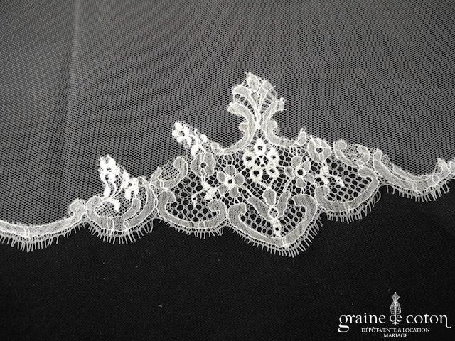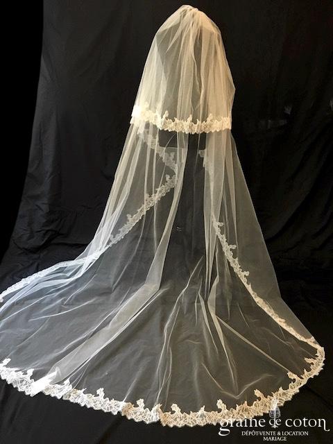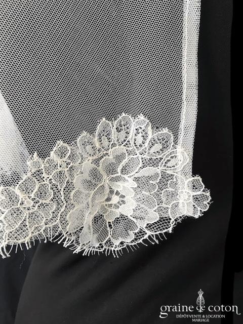 Voile long en tulle ivoire clair bordé de fine dentelle de Chantilly. Non monté sur peigne, à fixer avec des pics à chignon.