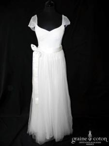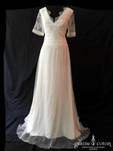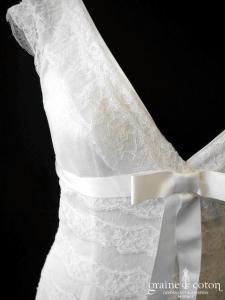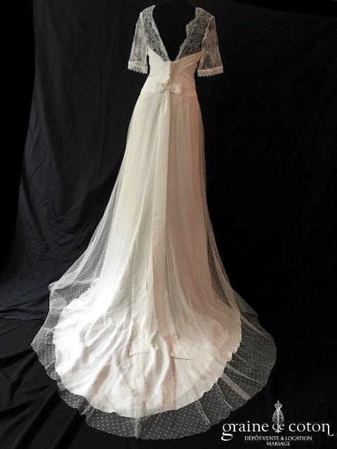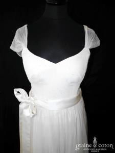 Boléro en fine dentelle de Chantilly ivoire à manches courtes et encolure bateau. Raffiné et délicat.