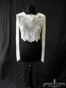 Boléro en fine dentelle de Chantilly ivoire à manches longues et encolure bateau. Raffiné et délicat.