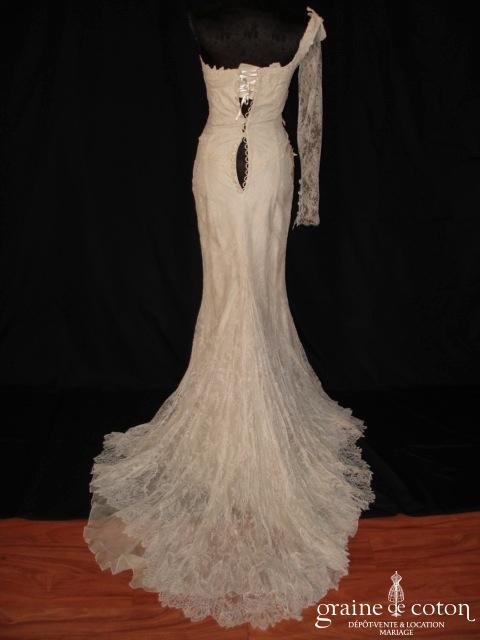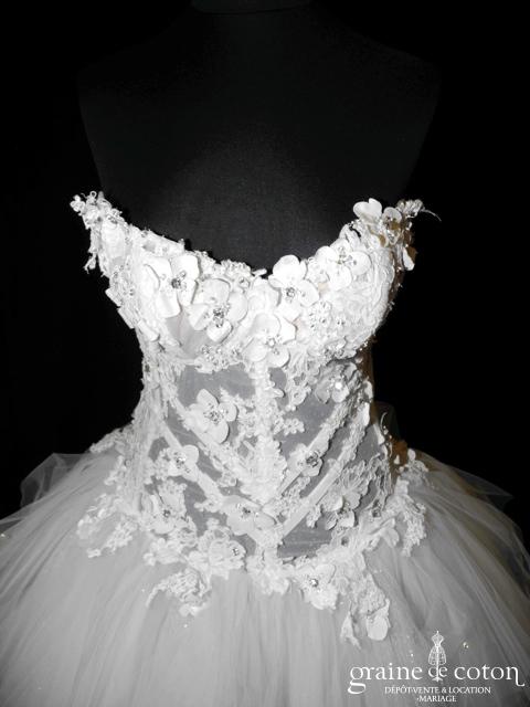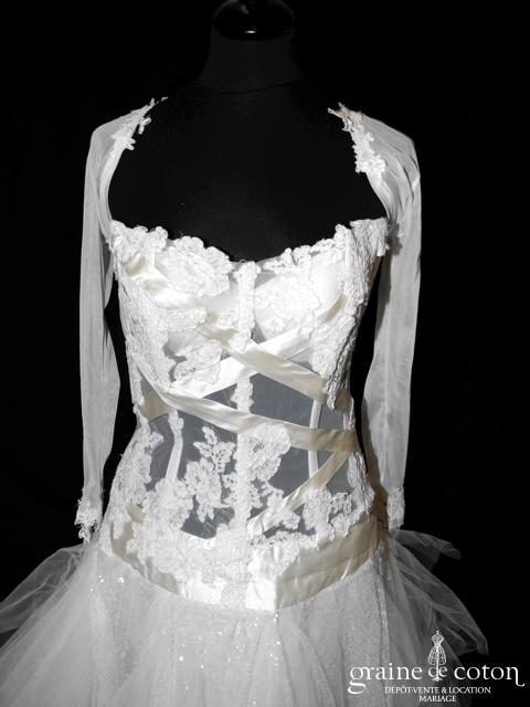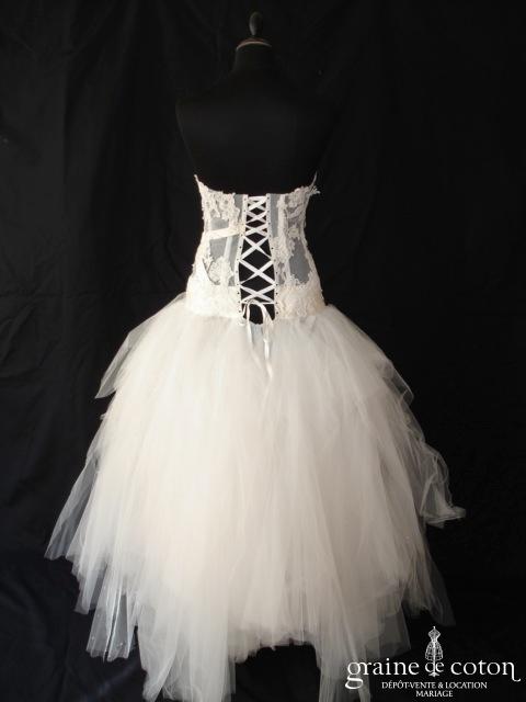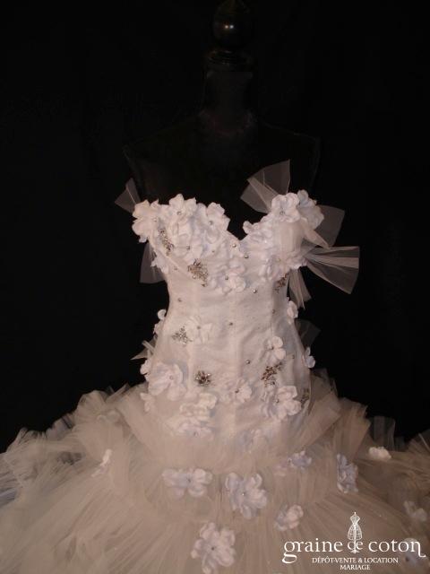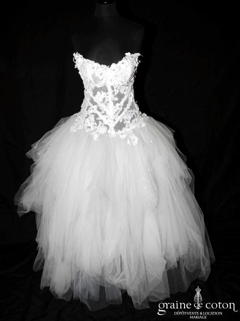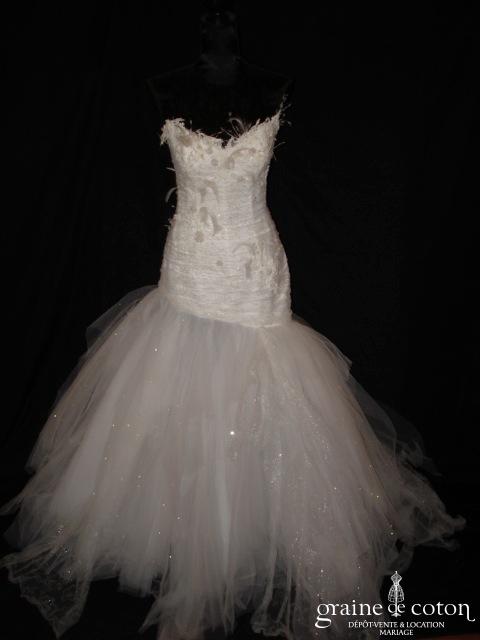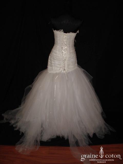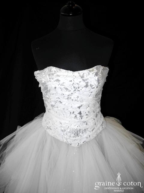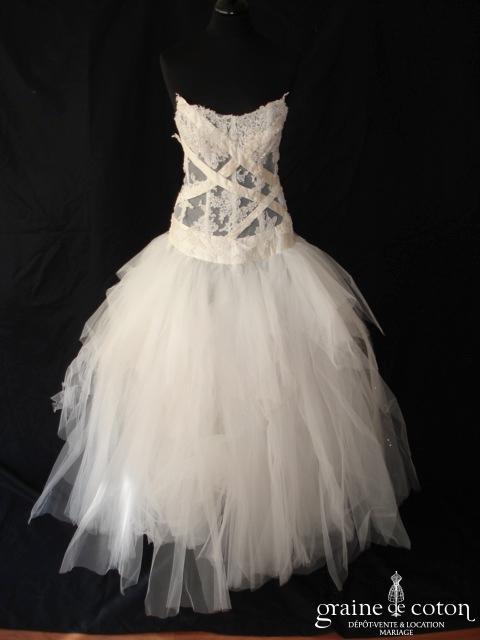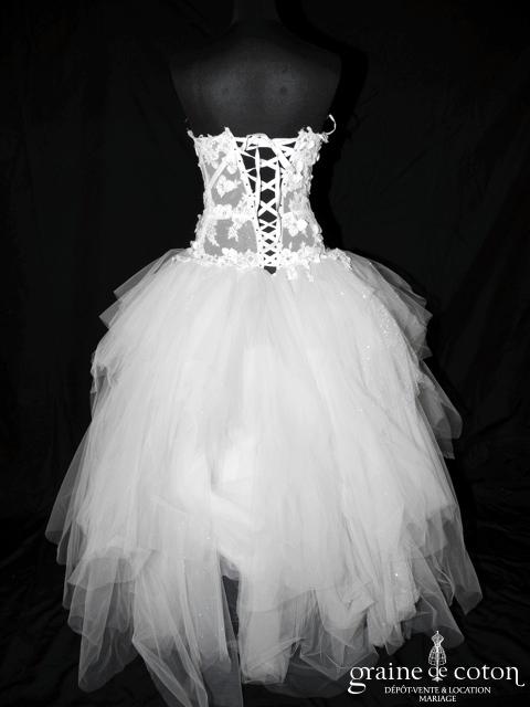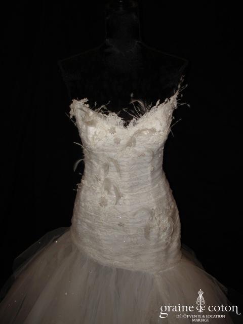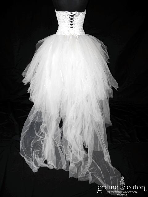 Robe une pièce blanche : bustier en dnetelle avec baleines apparentes et plumes, dos lacé. Jupe taille basse en mouchoirs de tulle, certains pailletés. Beau volume tout en souplesse, finitions …