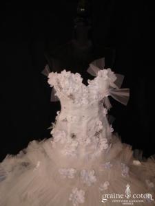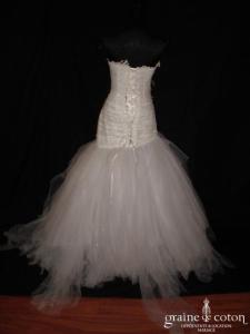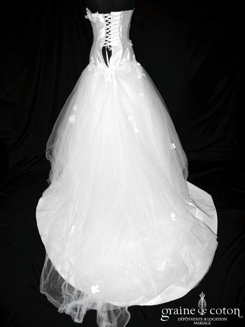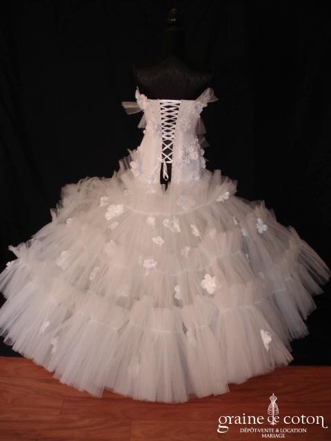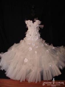 Robe une pièce en tulle blanc : bustier en tulle plissé, taille empire et taille haute marqué par une ceinture noeud. Dos lacé. Jupe en 3 larges volants de tulle, …