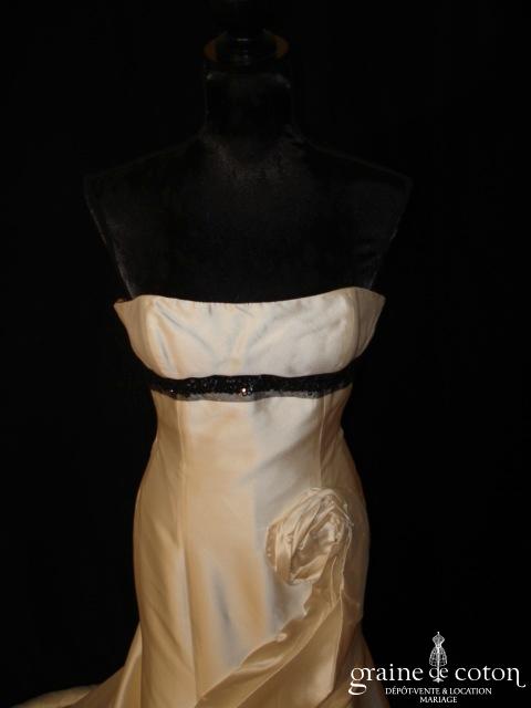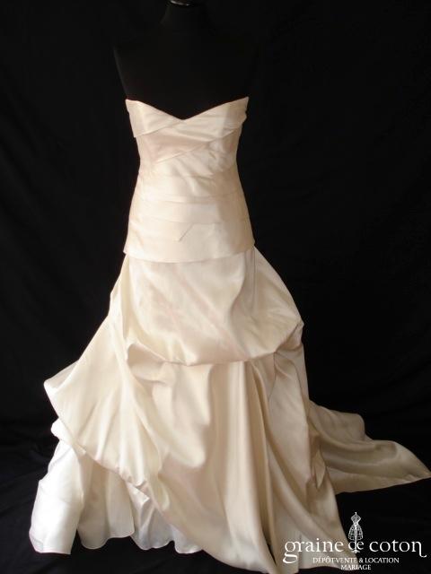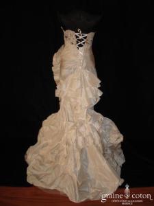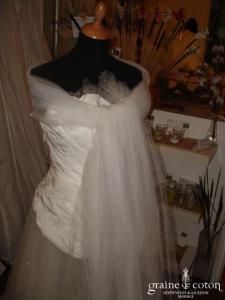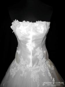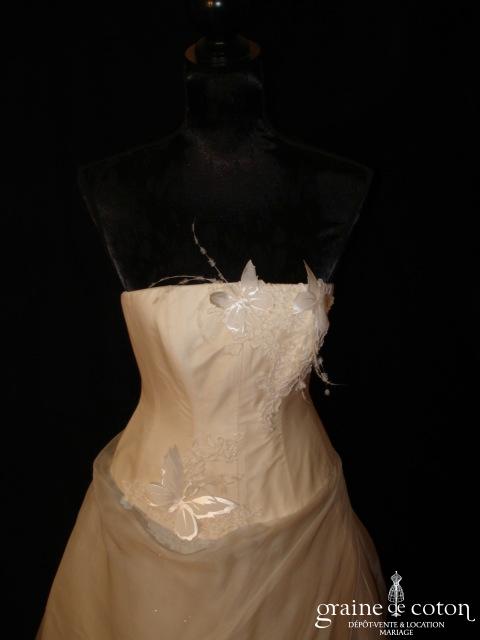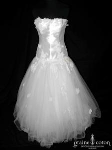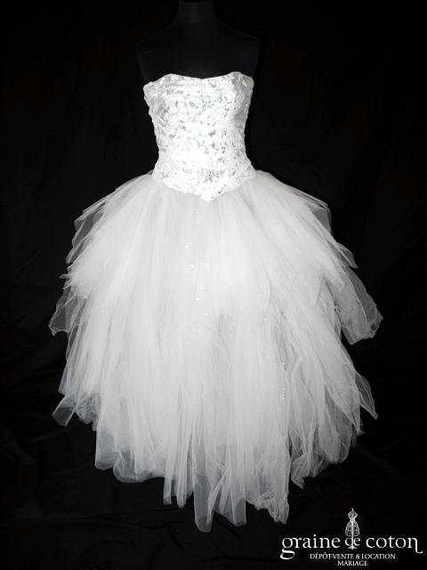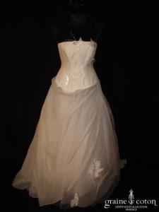 Robe une pièce composée de 2 robes : une sous robe bustier en soie ivoire lacée dans le dos, jupe légèrement évasée. La sur robe est en tulle plumetis pailleté …