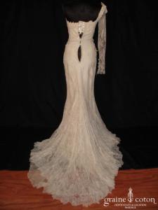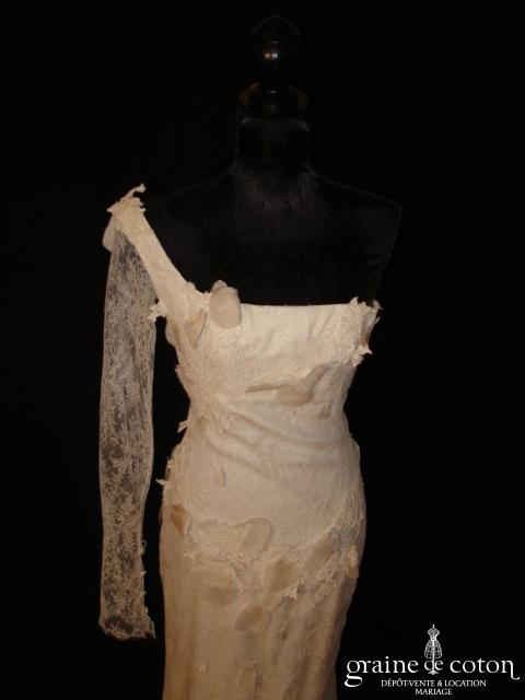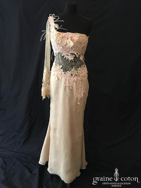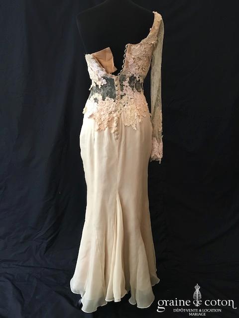 Robe une pièce en soie champagne : bustier asymétrique en fine dentelle chair (transparente au niveau du ventre), champagne et rose, une manche longue. Dos boutonné, jupe taille basse sirène …