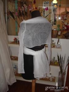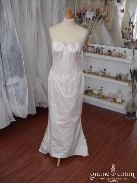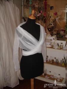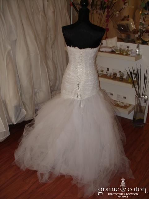 Robe une pièce blanche : bustier en larges bandes horizontales de mikado, dos lacé. Jupe taille basse en tulle blanc pailleté, ourlé de 2 biais de satin. Voluptueuse, lumineuse et …