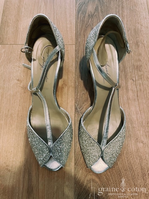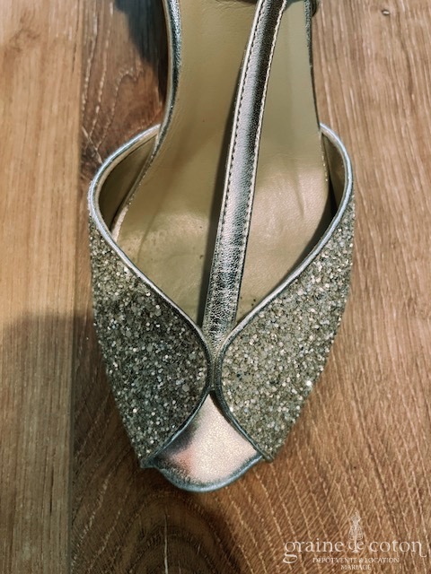 Mules pointues façon babouches, petit talon de 4 cm. Paillettes cousues sur le tissu ocre. Originales et agréables à porter.