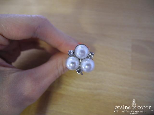 Papillon pince blanc pailleté avec traînée de perles Swarovski rose. Quelques pinces à chignons montées sur la décoration permettent d’agrémenter facilement n’importe quelle coiffure.